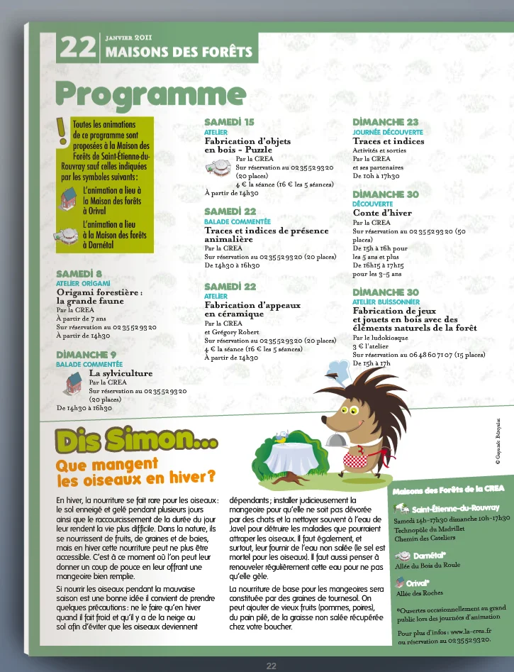 Création d’une famille de hérissons, mascottes des Maisons des Forêts de la Métropole Rouen Normandie. Déclinaisons en fonction des supports de communication et illustration de la Rubrique « Dis Simon… » pour le CréaMag.